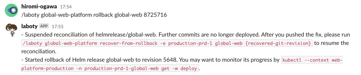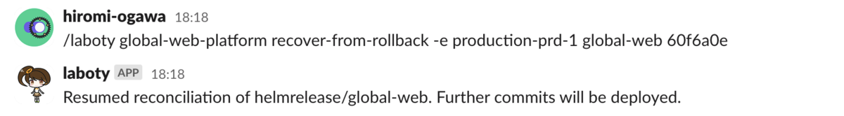 /laboty global-web-platform recover-from-rollback {アプリケーション名} {回復したコミットハッシュ} このスラッシュコマンドは、自動デプロイを再開するためのものであるため、回復したコミットハッシュを渡す必要はないと思われるかもしれません。しかし、先に説明した私たちのデプロイフローでは、アプリケーションリポジトリの main ブランチに PR がマージされてから HelmRelease の .spec.valuesまでイメージのタグが伝搬するまである程度時間がかかります。そして開発者が recover-from-rollback を実行したタイミングでまだ回復したコミットが HelmRelease に反映されていないと、自動デプロイを再開した途端に古い(回復前の)イメージのデプロイが始まってしまいます。そのようなミスを防ぎ、意図したコミットのイメージからデプロイが再開することを確実にするため、回復したコミットハッシュを引数として受け取ってそれを確認するような実装にしています。具体的には、このスラッシュコマンドは下の操作を順番に行います。
