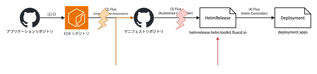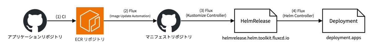 .spec.valuesに記述されたイメージのタグを更新するコミットを作成してマニフェストリポジトリへ push します。HelmRelease というのは Flux が Helm のリリースを管理するために用いるカスタムリソースで、.spec.valuesに Helm リリースの Values を記述しておくと Helm Controllerが自動でhelm installやhelm upgradeを実行します。 - マニフェストリポジトリの内容は Kustomizeで構成されており、Flux の Kustomize Controllerがマニフェストリポジトリの内容を自動的にクラスタへ反映するように設定されています。これにより先ほど push された